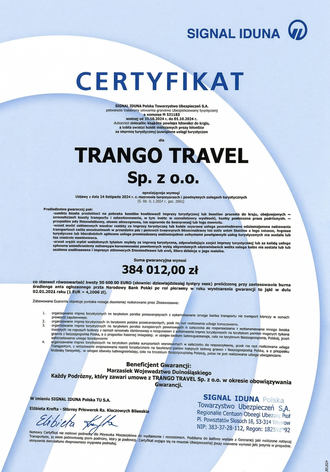 Od lat prowadzimy w 100% legalną działalność turystyczną – z gwarancją ubezpieczeniową i wpisem do rejestru organizatorów turystyki. Zawsze dbamy o to, by formalności były dopięte na ostatni guzik, by nic nie mogło nas zaskoczyć w najmniej oczekiwanym momencie. Co roku odnawiamy gwarancję we współpracy z firmą Signal Iduna, a do rejestru jesteśmy wpisani pod numerem 1120/71/2025 (nr ewidencyjny 42986).